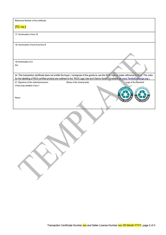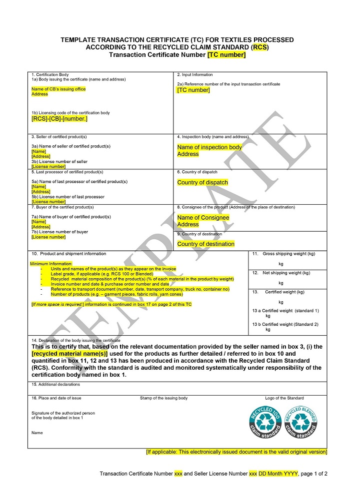 Giấy chứng nhận giao dịch RCS (TC – Transaction Certificates) cấp cho (các) lô hàng hóa đáp ứng tất cả các tiêu chí của sản phẩm RCS, bao gồm TC đơn và TC nhiều lô hàng