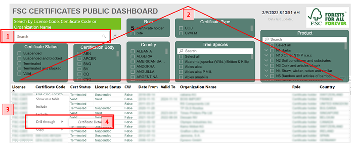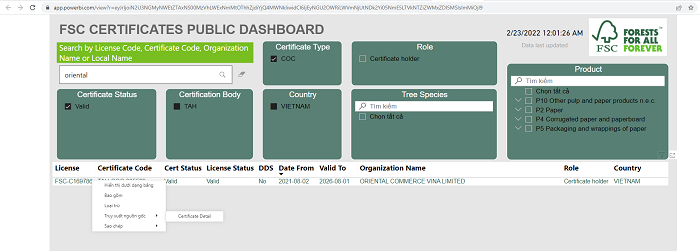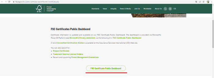 Kéo xuống dưới, ấn chọn FSC Certificate Public Dashboard